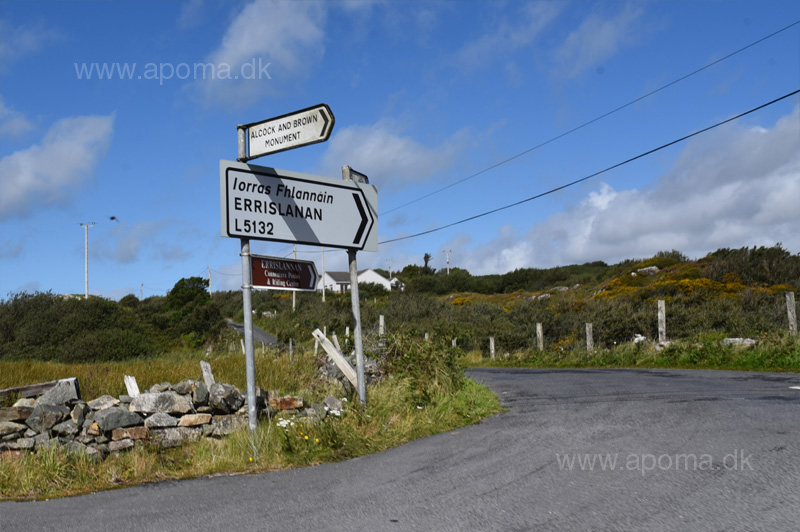 Lidt syd for Clifden på vejen R341 viser et skilt af til Alcock & Brown Monument - se teksten herunder.