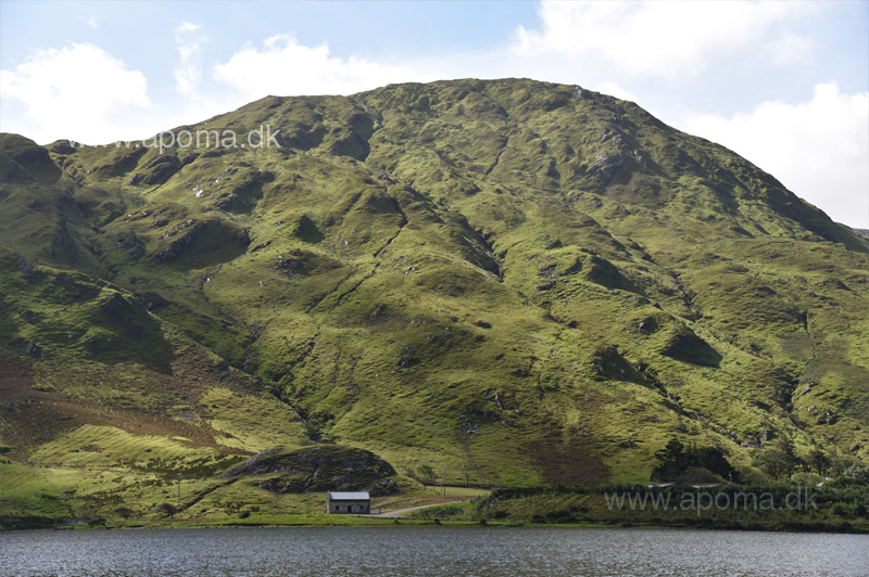 På fotoet ses Mayos højeste bjerg, Mweelrea, på 814 meter. Faktisk er det en rimelig stejl skråning, der skyder op fra fjorden til 814 meter over knap 2 kilometer.