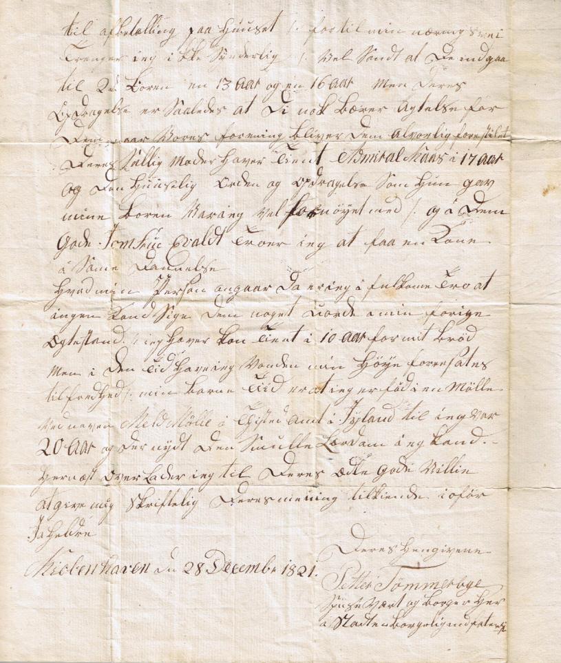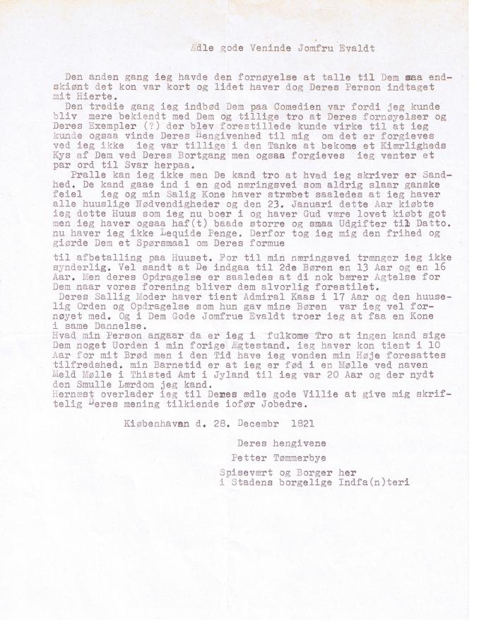 Anna Maria døde af brystsyge i 1821. Peter søgte kongelig bevilling om at blive gift med Ane Kirstine. Det blev de i april 1822. De fortsatte med at drive spiserestauranten i Pilestræde. Efter Peters død i 1840 fortsatte hun alene frem ca. 1850. De scannede billeder herunder er Peters frierbrev til den "ædle gode veninde Jomfru Evaldt", dateret d. 28. december 1821. Til venstre er fars oversættelse, mens de to billeder til højre er scanning af original-brevet! Jeg aner ikke, hvor mor og far fik alle de skønne gamle ting og breve fra, men kilderne er mange: Mors egen mor Inger, mors moster Gerda, mors bror Preben Engsig-Karup, denne hustru, Martha, og andre.