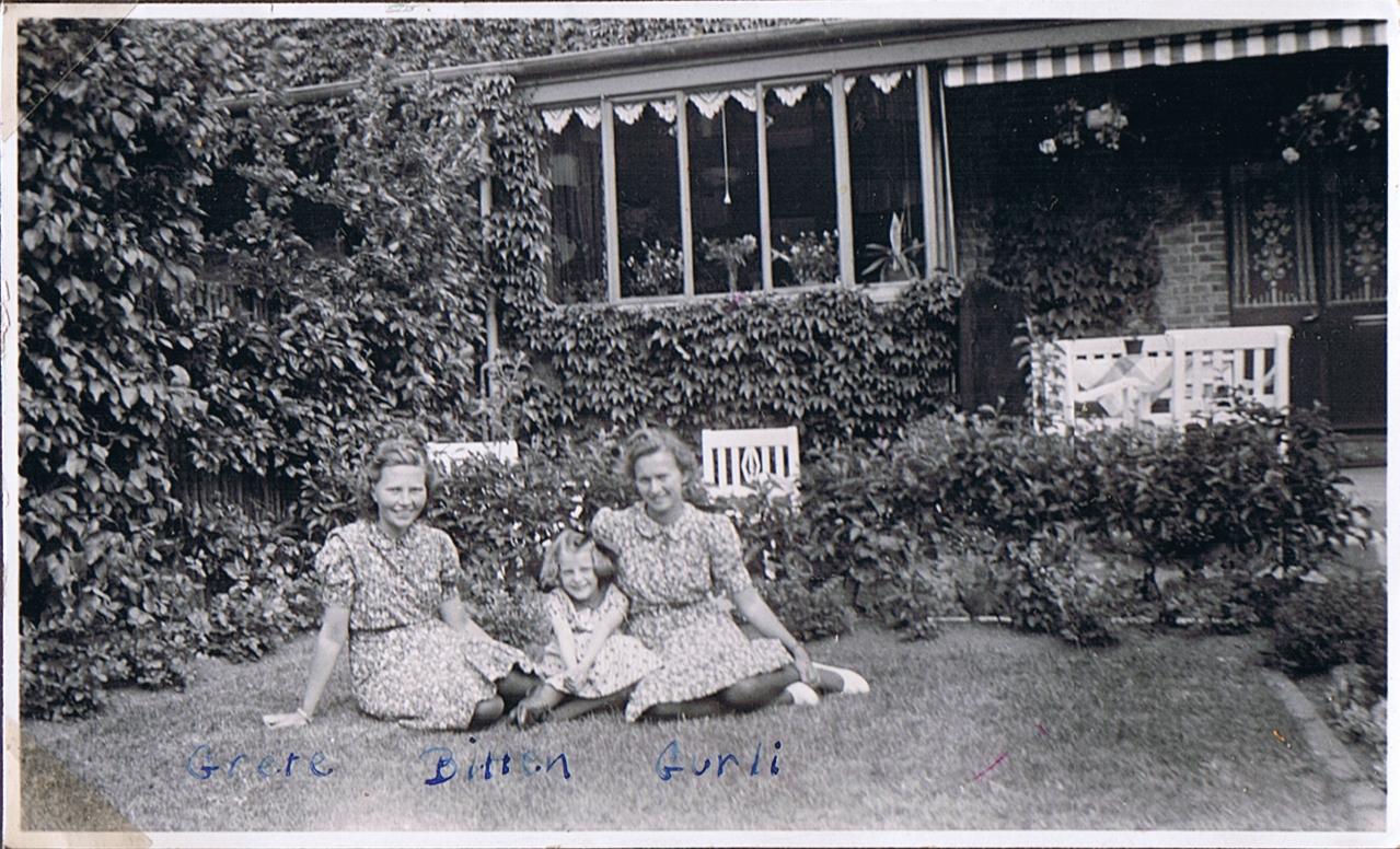 Bitten i selskab med Grete til venstre og Gurli til højre. Fotoet er taget i Møller-Sørensens have i 1941 - det ligner et sommer-foto.