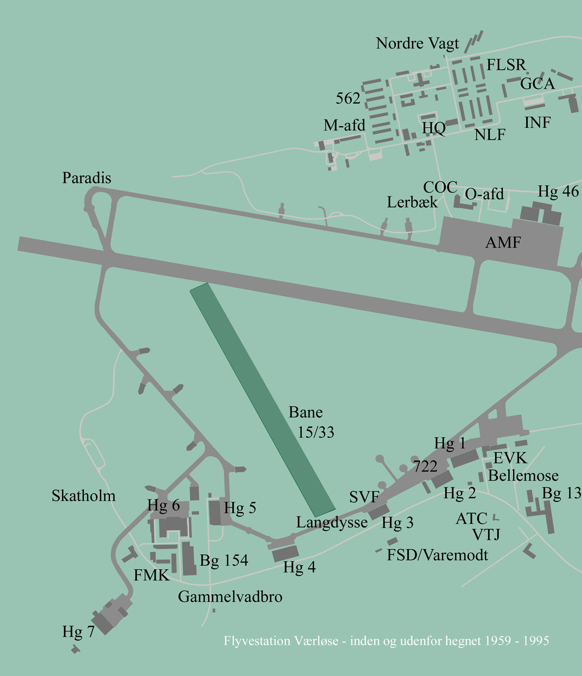 Den vestlige del af Flyvestation Værløse omkring 1980 [1-1]. Klik for at forstørre. En del af de gårde, der forsvandt ved flyvestationens udbygning, er angivet på kortet. Det gælder bl.a. Langdyssegaard, Skatholm og Lerbækgaard.