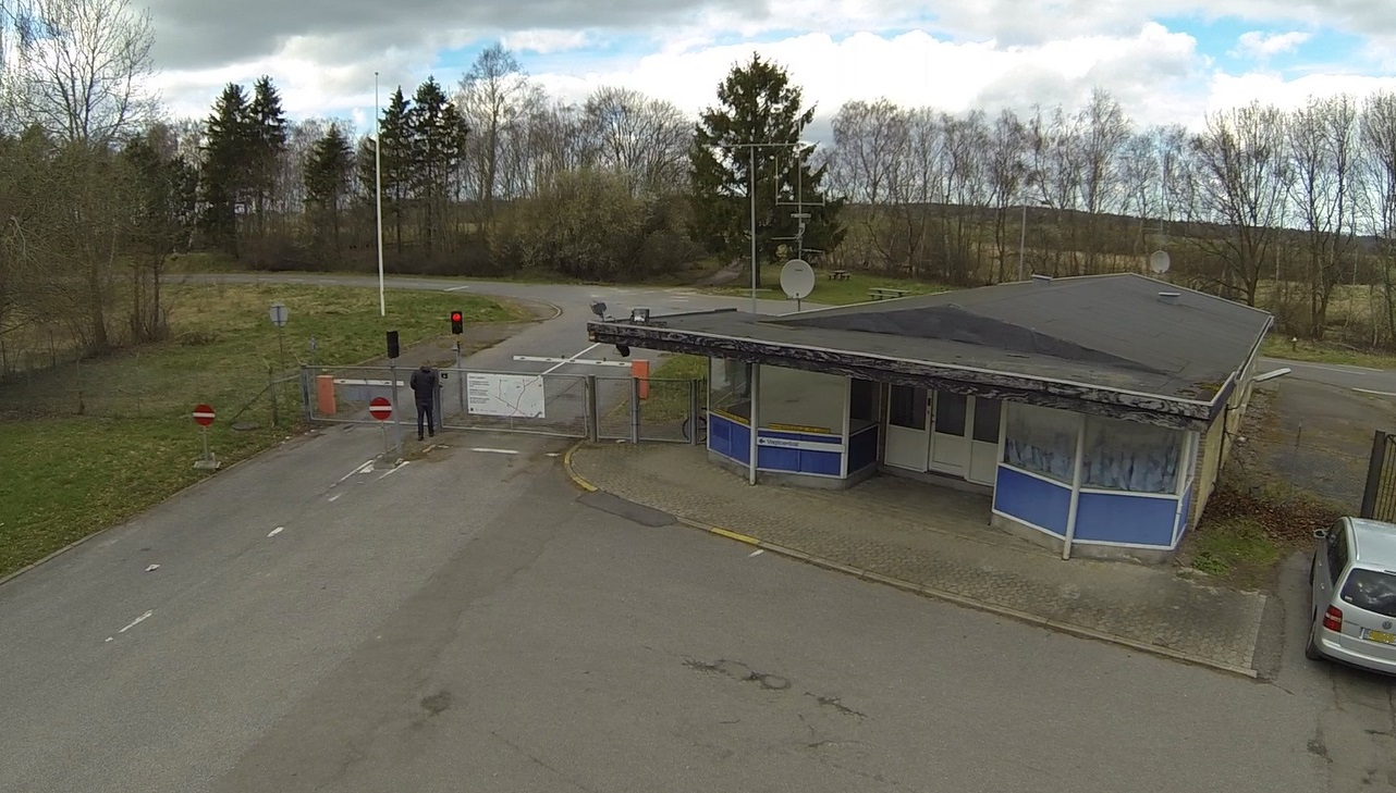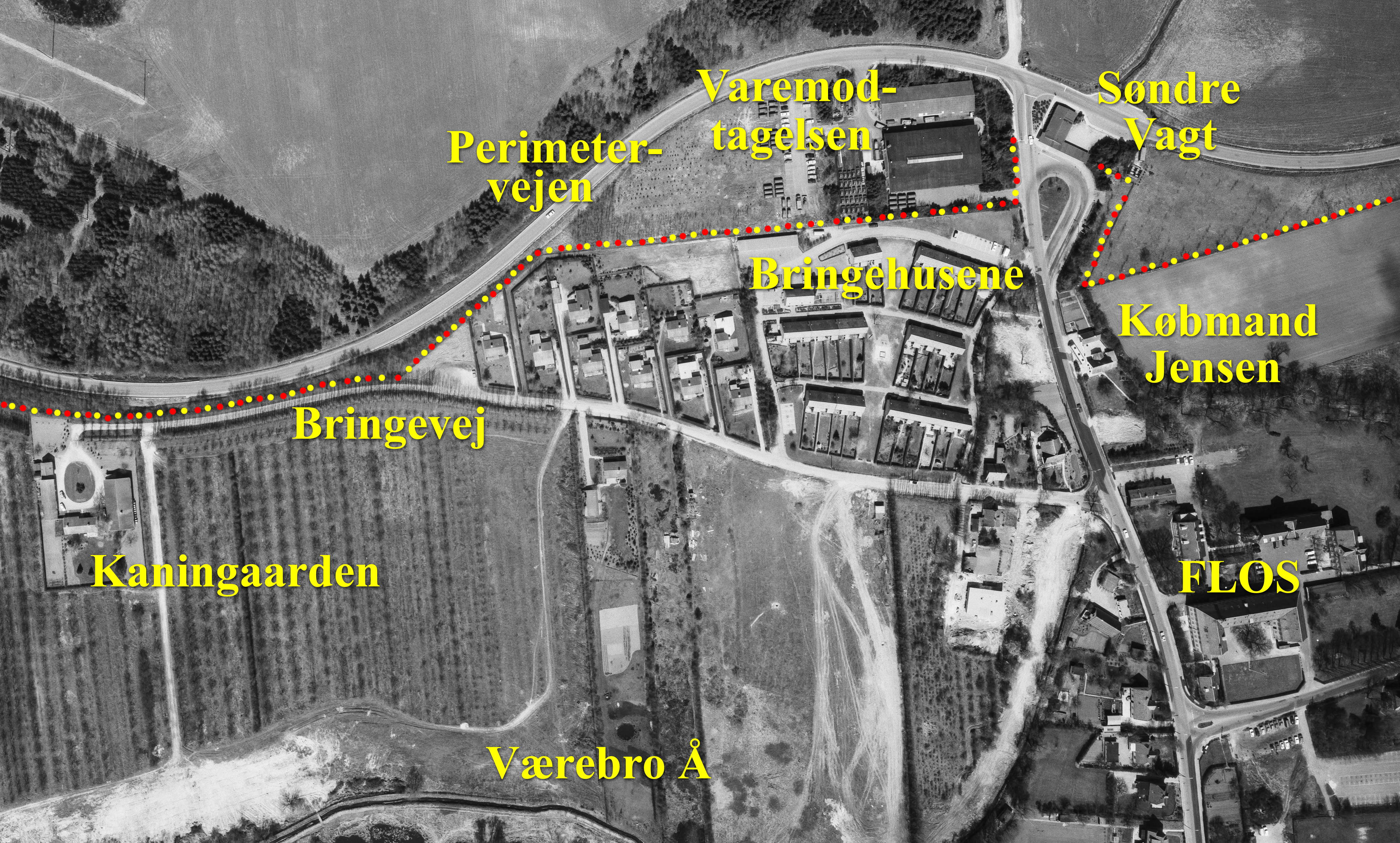 Luftfoto 1971 over Bringehusene, varemodtagelsen, Søndre Vagt, Kaningården og FLOS. Den stiplede, rød-gule linje viser hegnets omtrentlige rute [2-10].