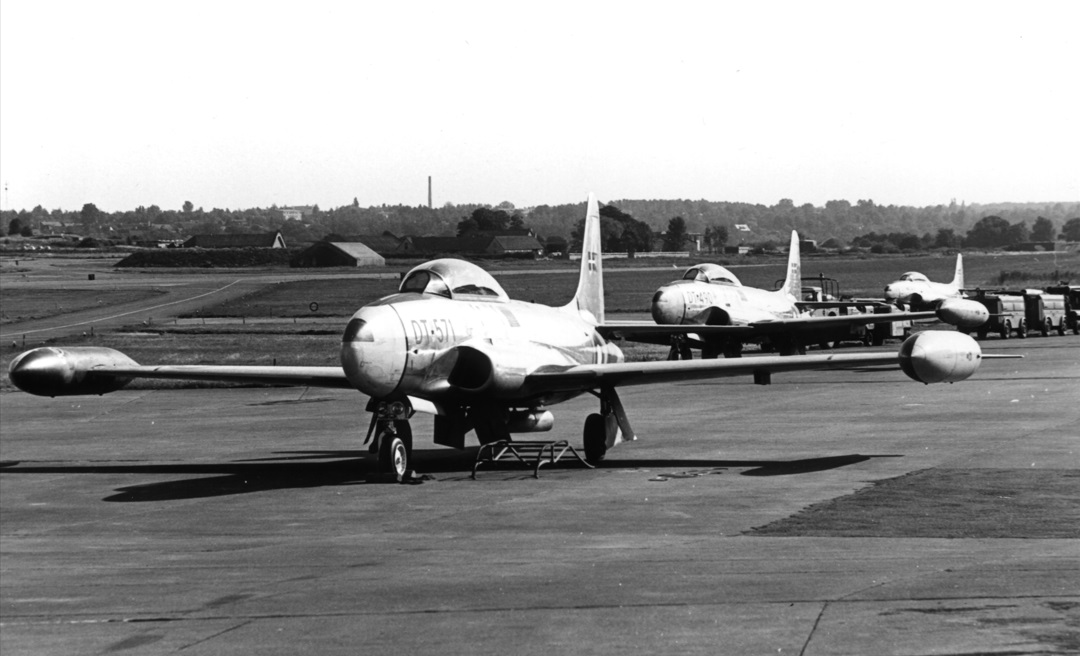 Midten: Lockheed T-33 Silverstar med droptanke for enden af vingerne. Fotoet må være taget medio 1970’erne, for man kan se shelters i baggrunden. Foto: Forsvarsgalleriet.dk [2-14].