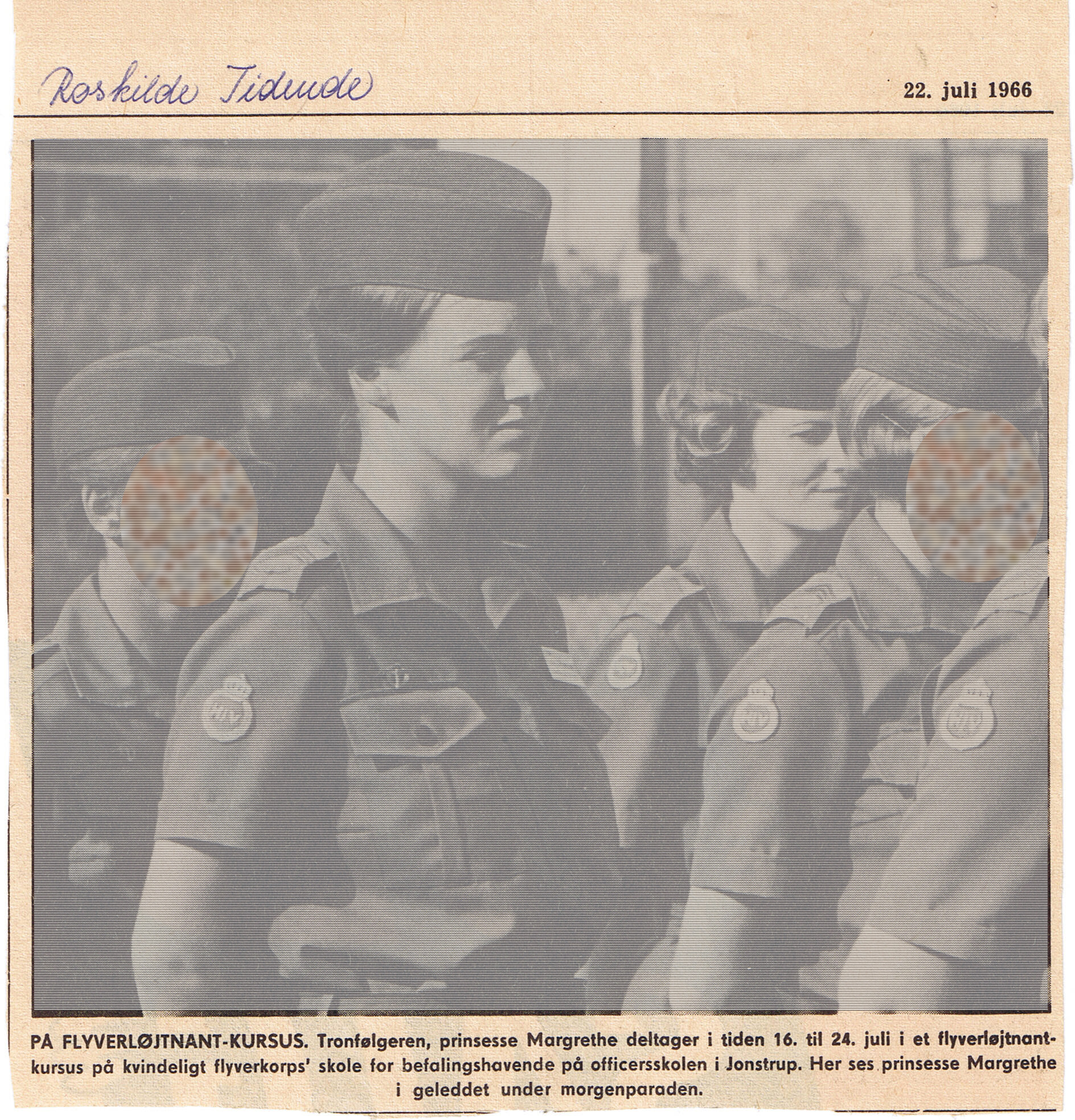 Herover: Udklippet af tronfølgeren, prinsesse Margrethe i Roskilde Tidende med min mor i geleddet bagved. Fotoet er sløret [2-17].