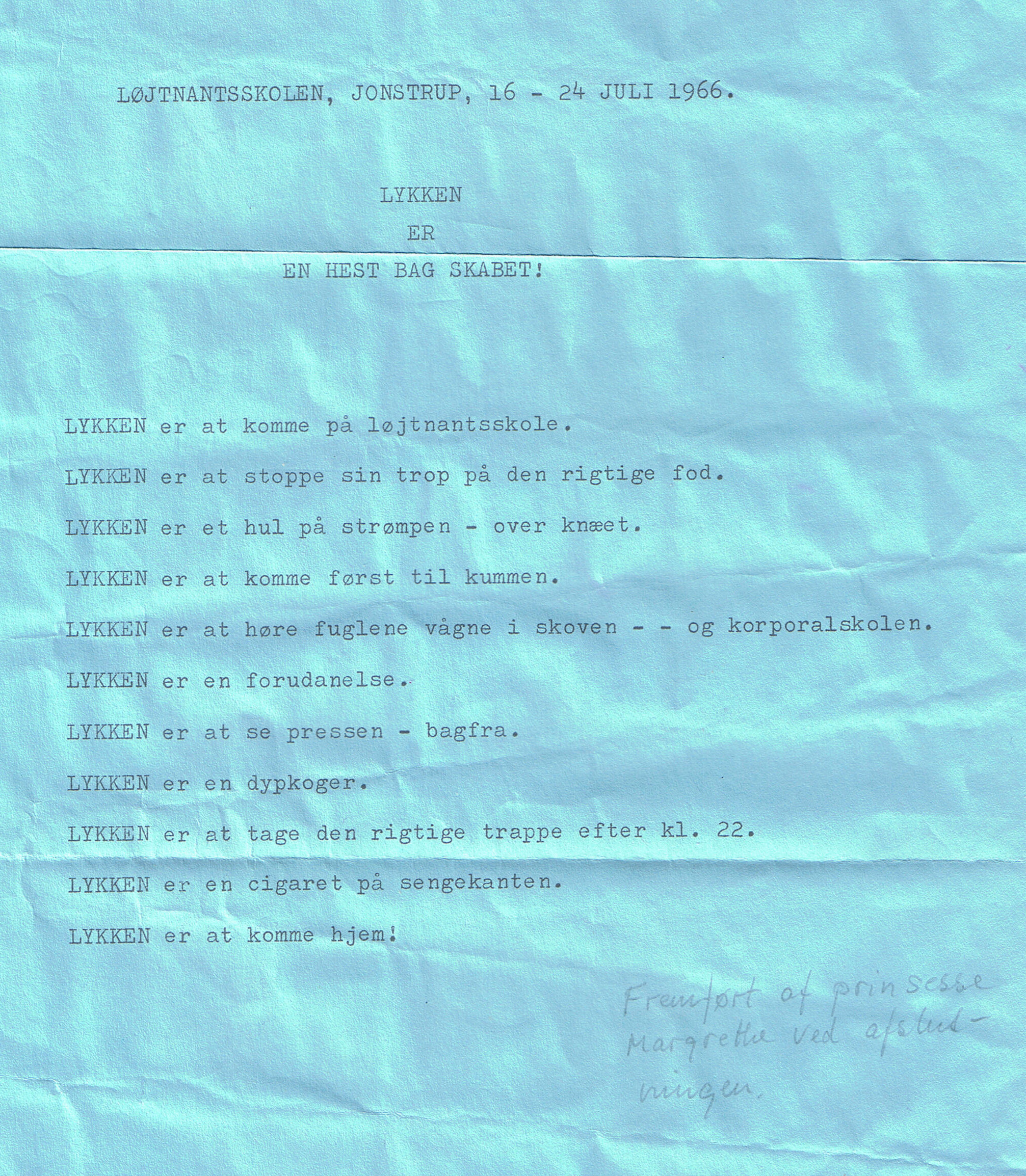 Herunder: Ved afslutningen på løjtnantskolen i juli 1966 blev eleverne bedt om at skrive en lille tekst. Prinsesse Margrethe skrev et lille digt: Lykken er en hest bag skabet! Min mor gemte det resten af sit liv.