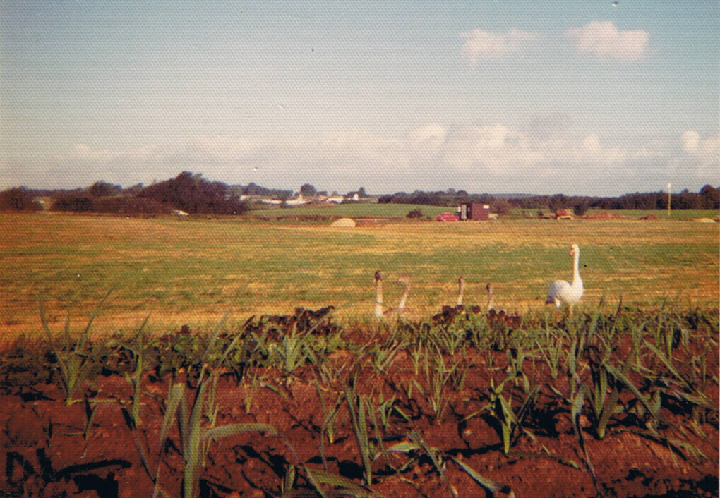 Nederst: Svanefamilie nær Tyskervejen - yderst til højre kan man lige netop se det trekantede skilt på toppen af stålstangen. Foto: Poul Madsen, okt. 1974.