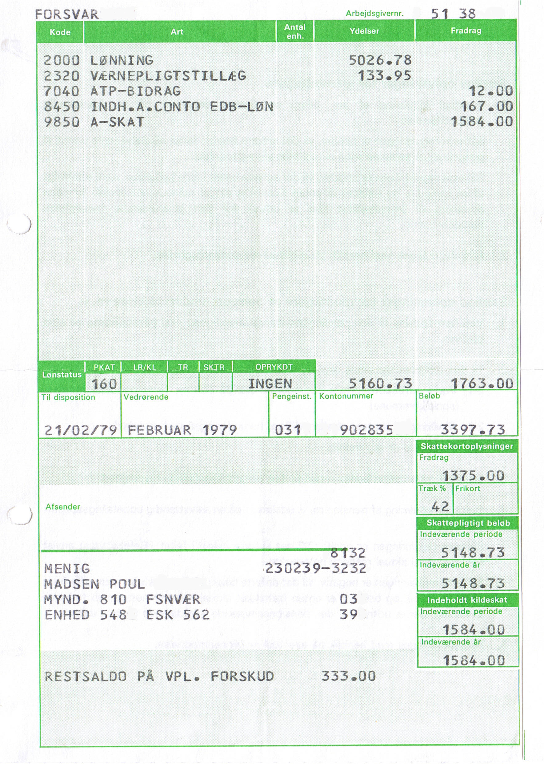 Min første lønseddel som værnepligtig, februar 1979. Visse data er ændret.