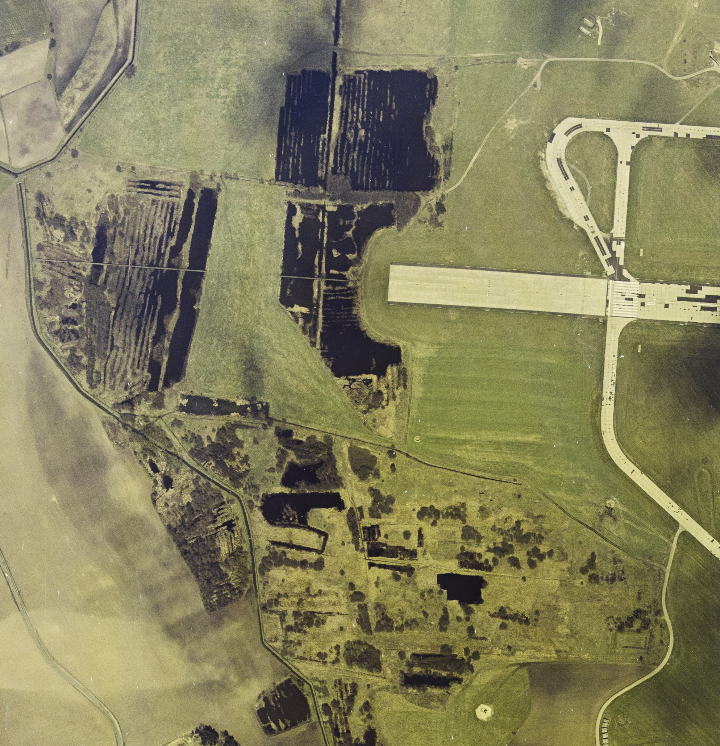 Luftfoto over Homeren og Knardrup Mose, [3-4]. De mørke arealer er vådområder. Fotoet angives taget i april 1971. Bemærk, at der ikke er en vej hele vejen rundt om baneenden. Engang var der en lille sti, men ved anlæggelsen af startbanen forsvandt stien. Først omkring 1990 blev der anlagt en vej, så Perimetervejen gik hele vejen rundt om banen.