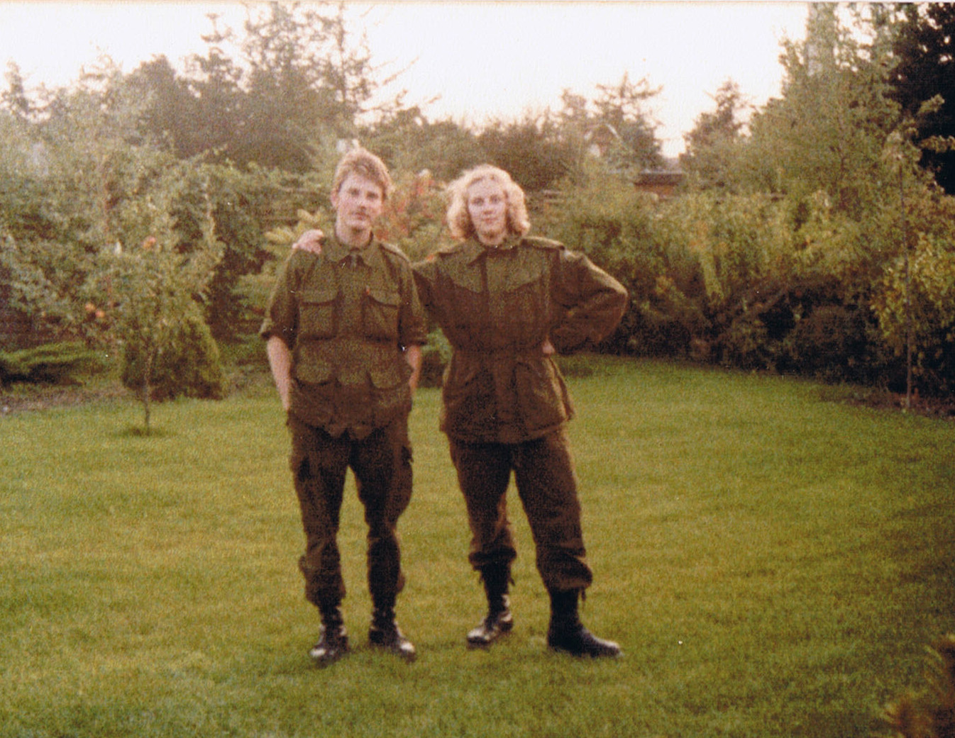 Nederst: Min søster og mig – jeg i øvelsesuniform, hun i kampuniform. Foto: Jeanne Madsen, juli 1979