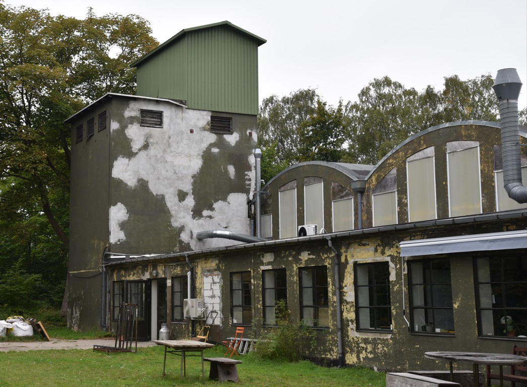 Sydsiden af Hangar 5, hvor faldskærmspakkeriet havde lokaler. I tårnet kunne man hænge faldskærme til tørring - oprindeligt var det brandslanger, man tørrede. Foto: Poul Madsen, sept. 2021.