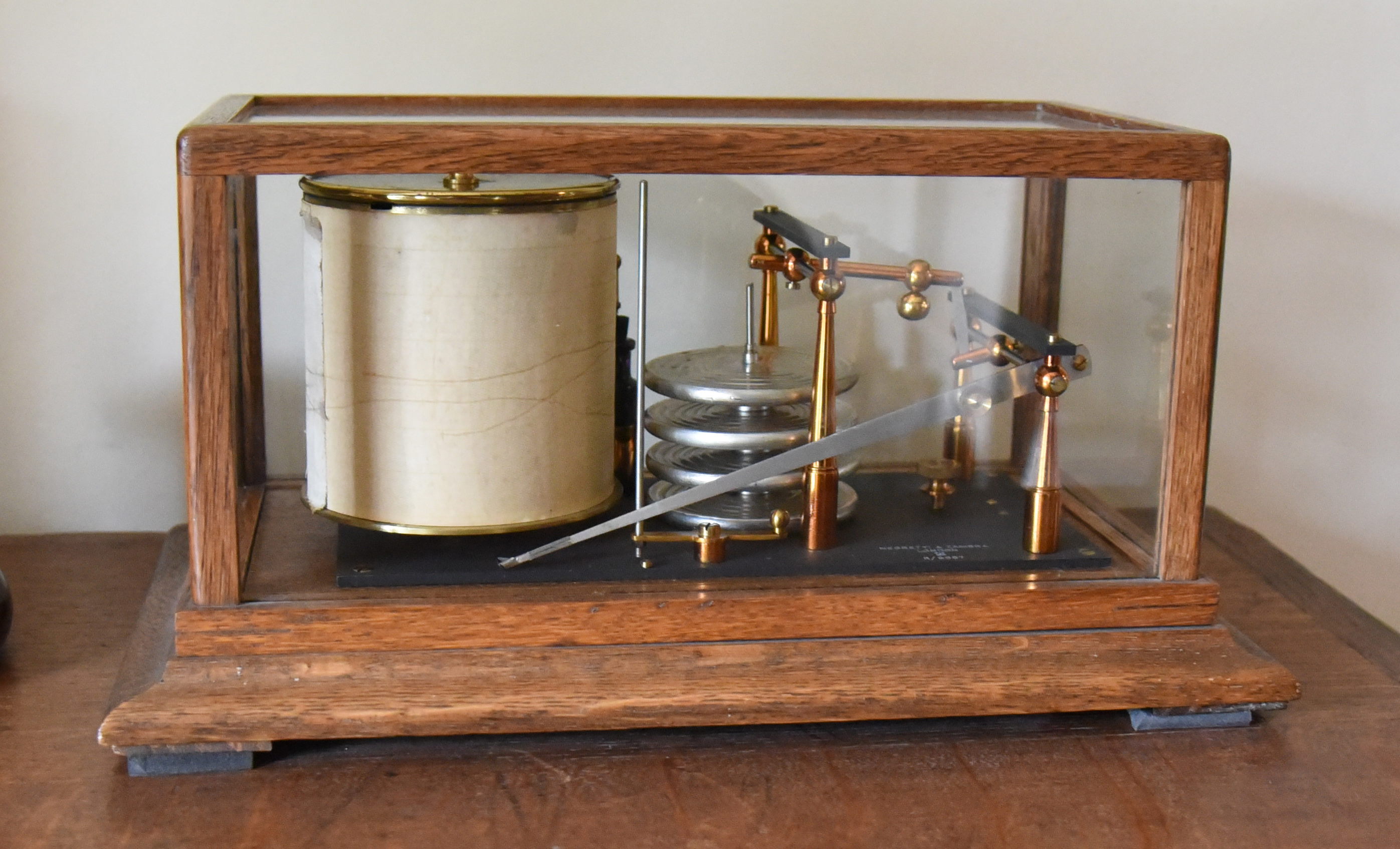 Ældre barograf – denne er fra Agatha Christie’s hjem, Greenway i England. Foto: Poul Madsen, sep. 2023.
