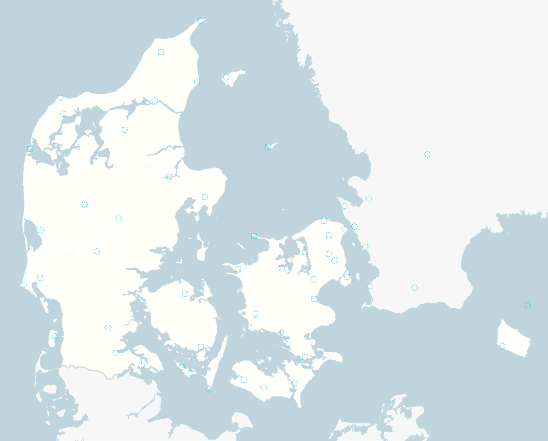 Herunder: Rekonstruktion af kort til plotning af vejrstationer. På de ”rigtige” kort var de blå cirkler mindre, og der var flere af dem. Tegning: Poul Madsen.
