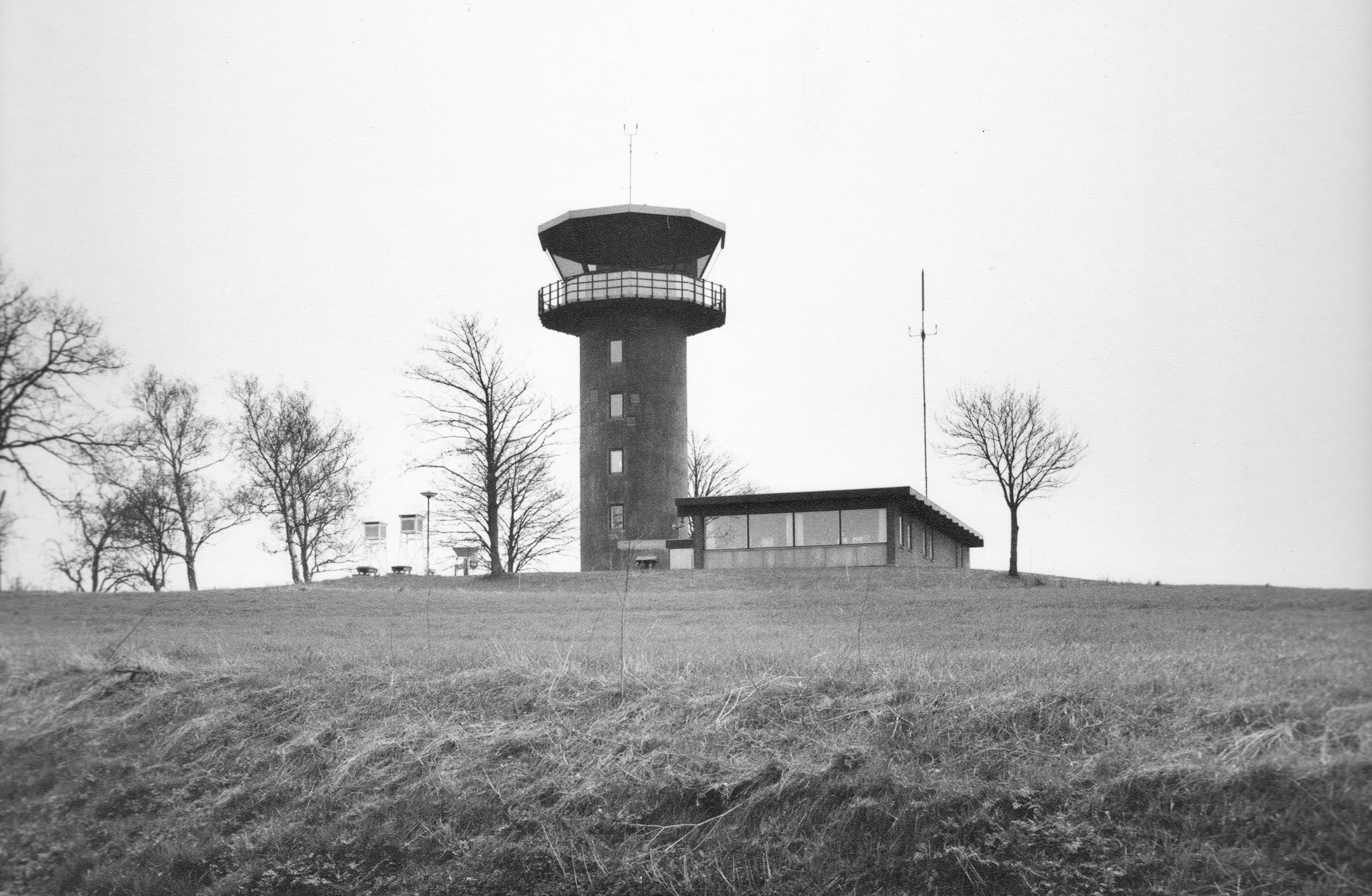 Kontroltårnet og Vejrtjenesten blev anlagt på en bakketop. Lige til venstre for Vejrtjenesten ses et par engelske hytter, og der står også en regnmåler. Foto: Forsvarsgalleriet.dk [7-3].