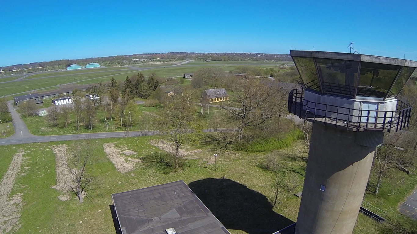 Herunder: Fra Vejrtjenesten og selvfølgelig især tårnet var der en fremragende udsigt over flyvestationen. Foto: Steen Pedersen, screen shot fra drone video maj 2016 [7-4].