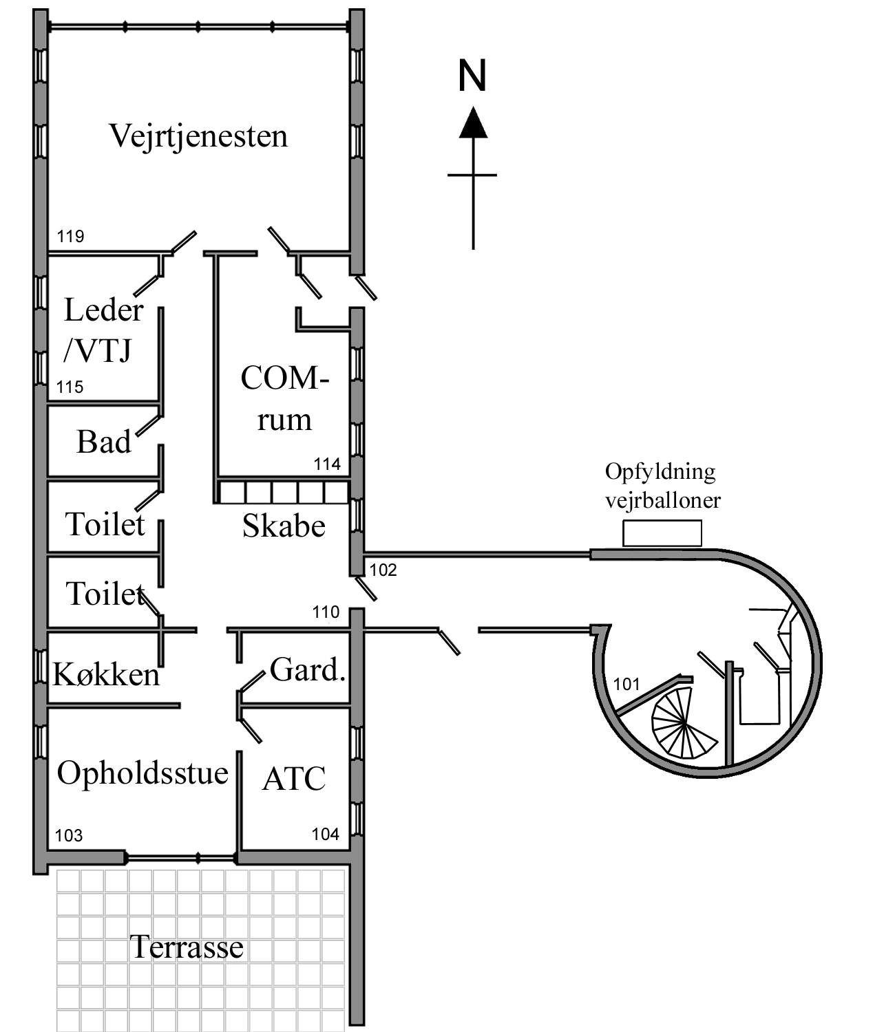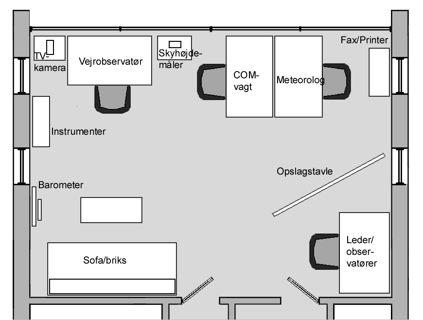 Nederst: Indretning af vejrtjenesten, som der så ud i 1981 – dels efter hukommelsen, dels hjælp fra Elin S. Petersen [7-6].