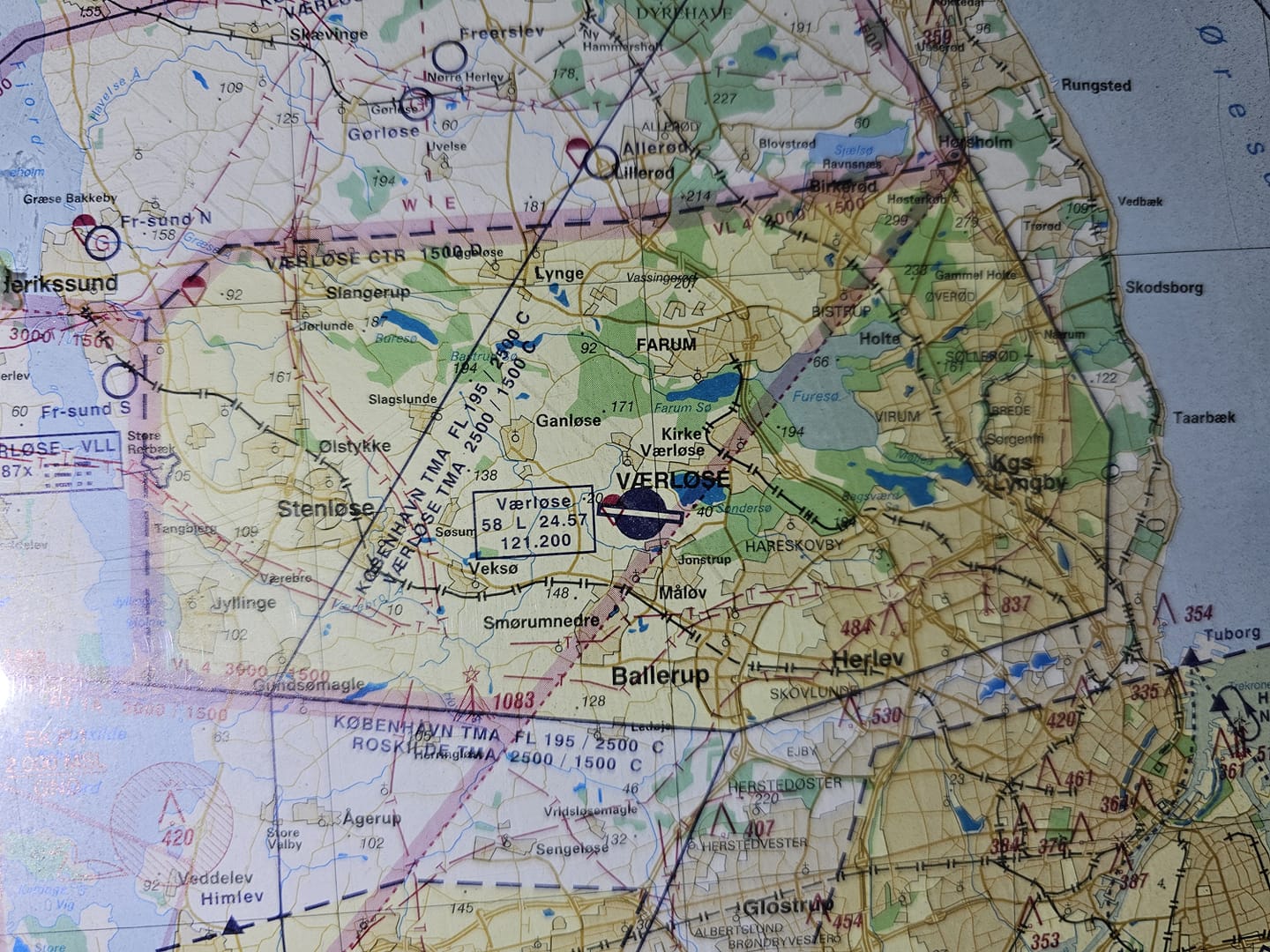 Foto af ICAO-kort over flyvestationens kontrolzone. Ukendt dato. På ældre kort var FSN’s zone formet som en halvcirkel. Allerød Flyveplads lå lige inden for halvcirklen. Men hvis flyene lettede mod nord og fløj direkte ud af zonen, behøvede de ikke kalde op – det var i hvert fald det, jeg fik at vide. Bemærk, at man for Værløse kan se et lille symbol for en faldskærm. Dette symbol kan også ses ved Bybjerg, landingspladsen i Sundbylille mellem Slangerup og Frederikssund. Der er også et symbol ved Allerød. De symboler fandtes ikke på ældre kort. Foto: Arno Jørgensen [7-8].