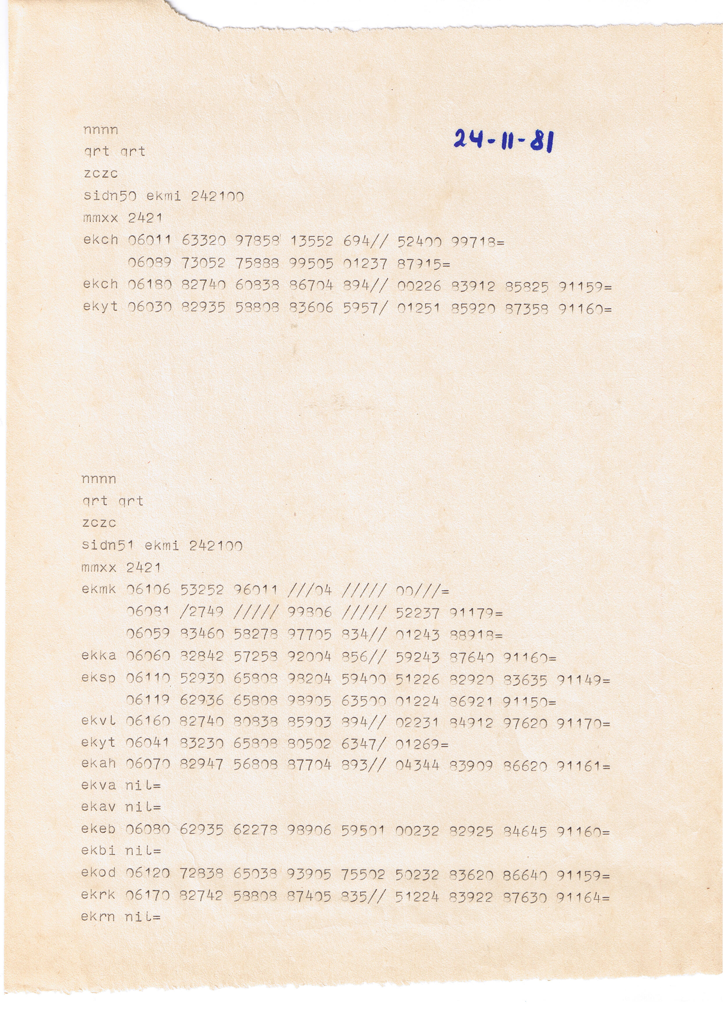 Scan af papirrullen med synopperne for kl. 21 z fra orkanen d. 24. november. På dette tidspunkt har orkanen toppet i hele landet – måske undtaget Bornholm. Læg mærke til 911-grupperne yderst til højre: De angiver det højest målte vindstød i knob. Flyvestation Værløse – ekvl – målte 70 knob som det højeste mellem kl. 18 z og kl. 21 z.