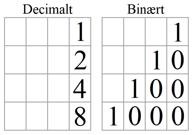 Det decimale 2-tal var altså lig med 10 binært, og man brugte to pladser i computerens processor. At gå fra en enkelt plads til to pladser svarede til en fordobling af tallet. Brugte man tre pladser og skrev 100 binært, svarede det til yderligere en fordobling. Det samme med fire pladser og 1000 binært.