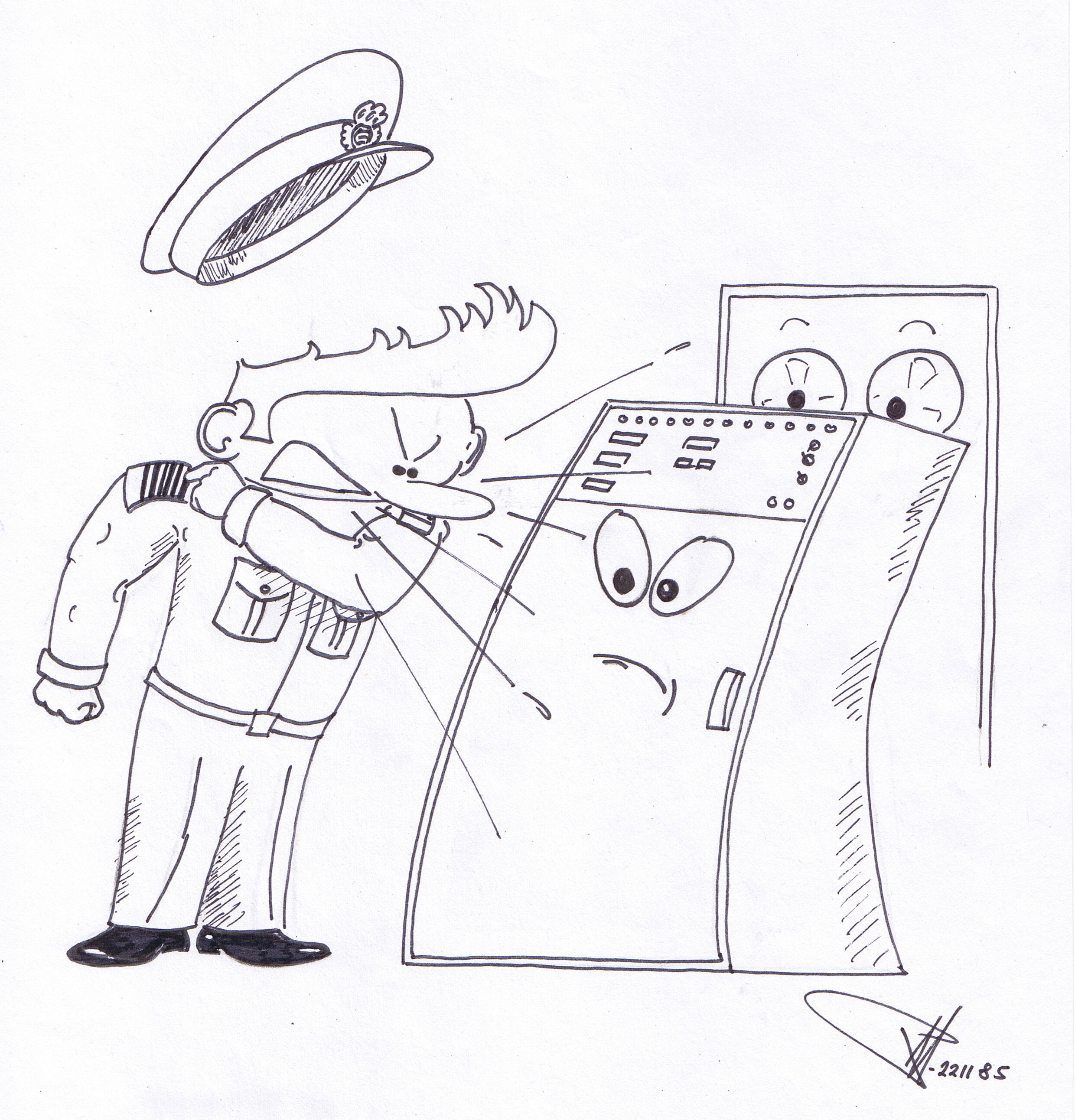 Herunder: Illustration i korrekt betjening af Hughes 5118 computer med perifert udstyr (båndstation). Tegning: Poul Madsen, nov. 1985.