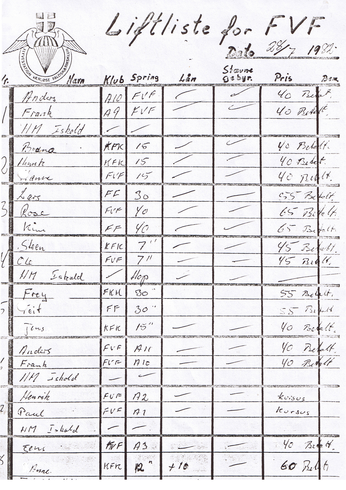 Herunder: Kopi af liftlisten fra stævnet d. 28. juli 1982.