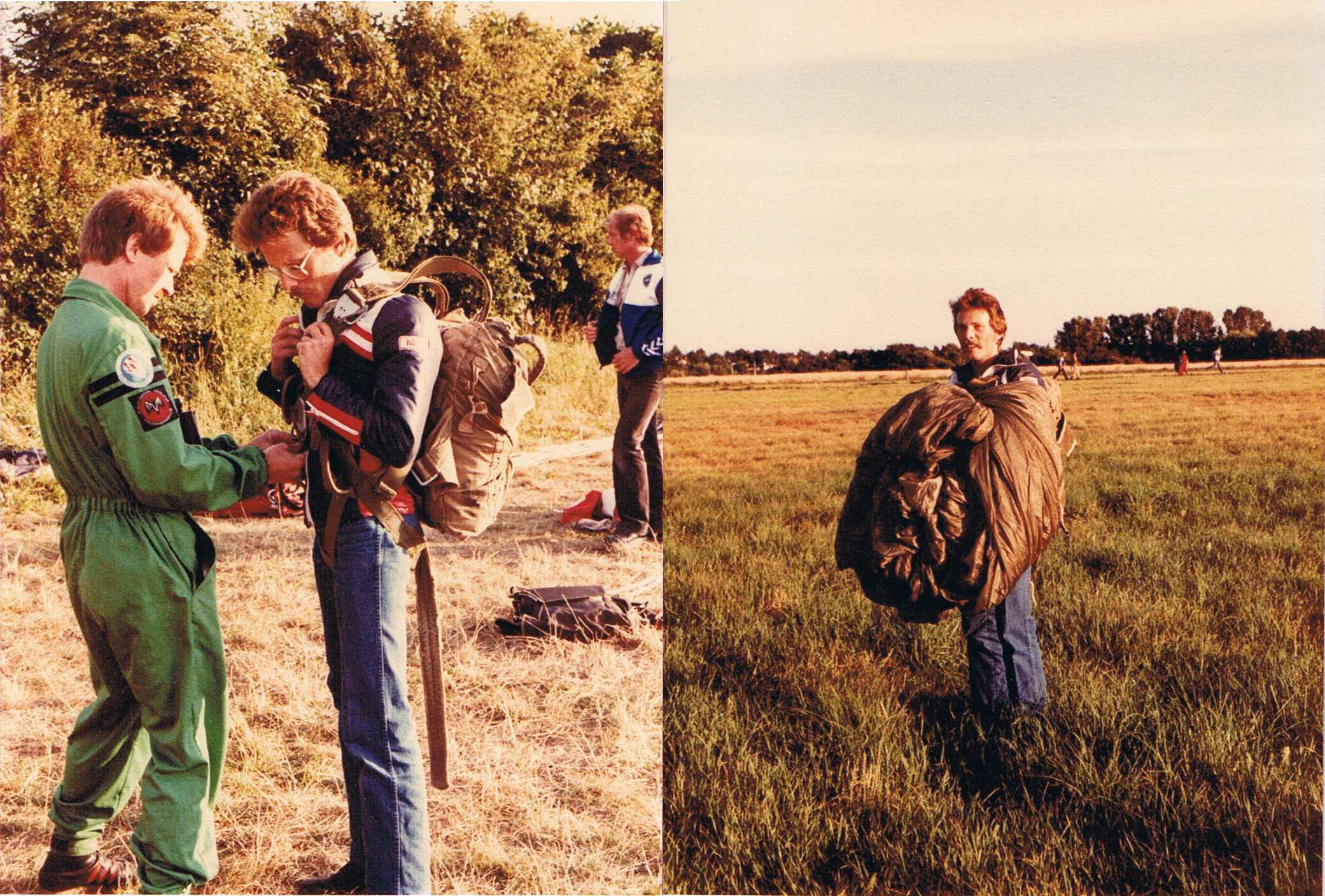Ole Dupont (til venstre) hjælper med seletøjet inden første spring. Til højre: Netop landet. Fotos: Kai Madsen.