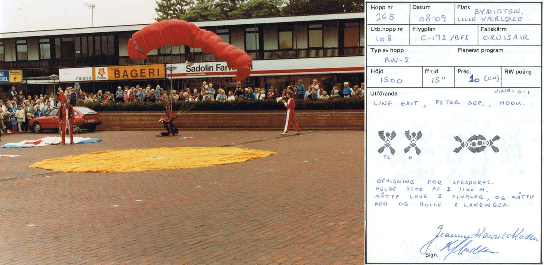 Herunder: Fra opvisningen på Bymidten september 1984. Stående til venstre er det Helge Neupart, til højre med megafonen er det Ole Dupont. Foto: Kai Madsen. Til højre ses springet registreret i min logbog.