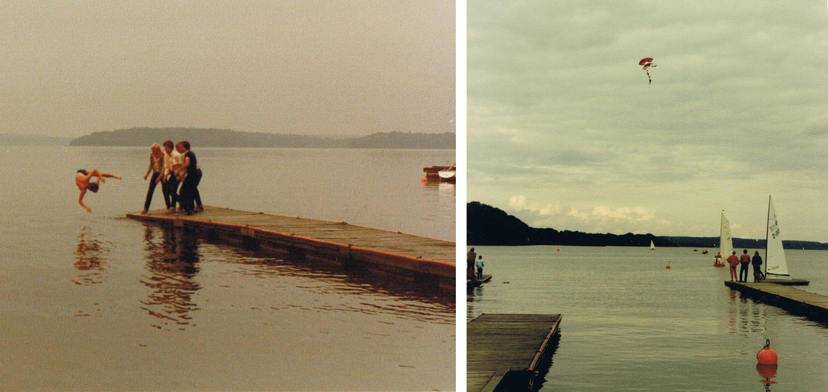 Herover til venstre: Springerne fra FVF og FF-66 mente da ikke, at forfatteren skulle snydes for vand efter den tørre landing på Egebakken, aug. 1984. Herover til højre: Erik Prip og forfatteren under skærmene på finale til landing i Furesøen, aug. 1986. Begge fotos: Kai Madsen.