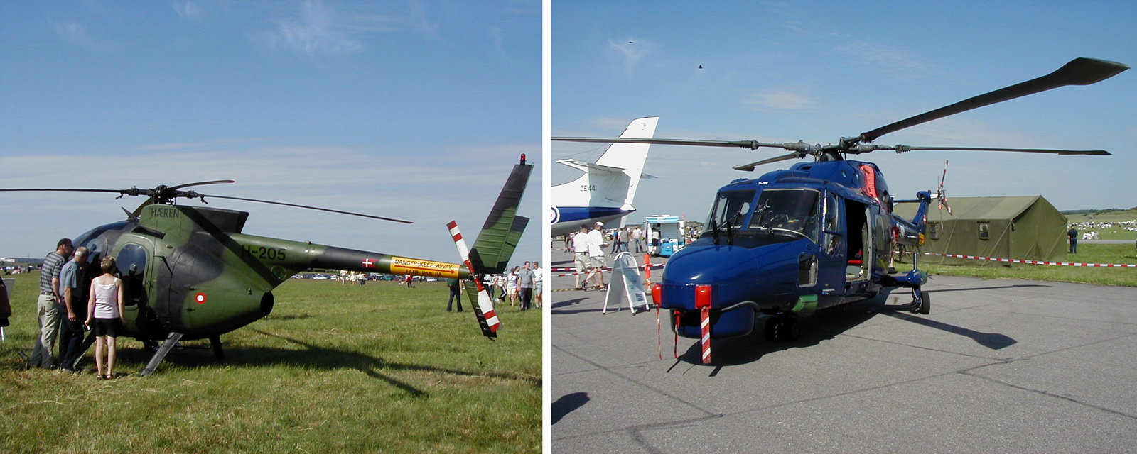 Herunder: Hughes 500 (til venstre) og Westland Lynx var begge helikoptere, som dagligt sås på Flyvestation Værløse. Her er det til Åbent Hus i juni 2002. Fotos: Richard Beck Madsen [10-3]