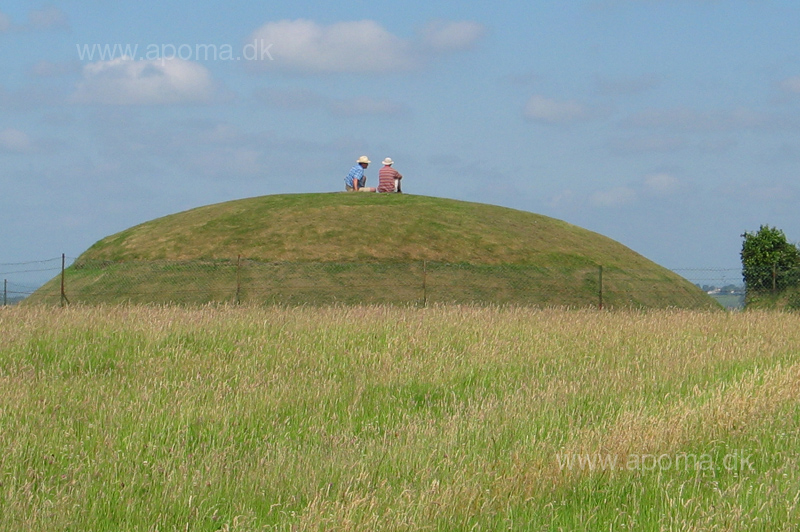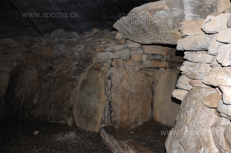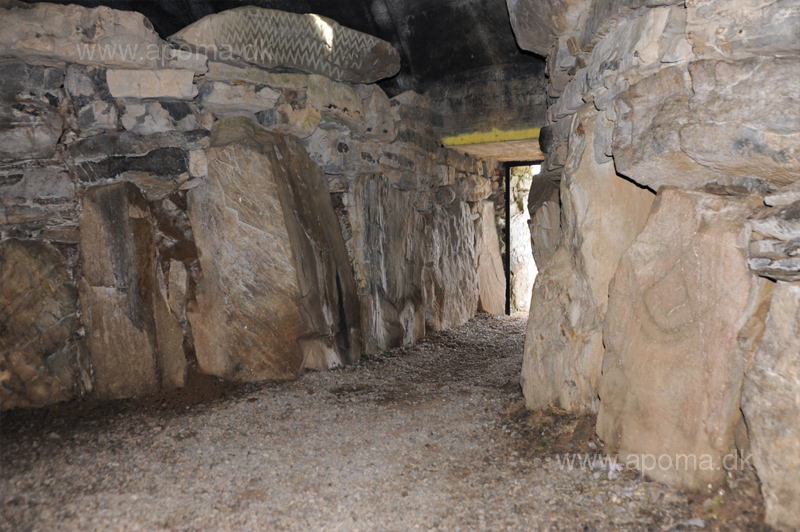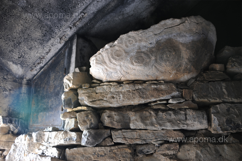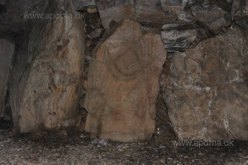 Her ses indgangspassagen. Læg mærke til stenen med de flotte zig-zag-linjer øverst i billedet. Den opretstående sten til højre har nogle indridsninger, som man mener er et ansigt.