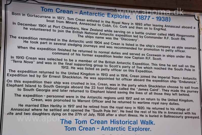 Tom Crean var født i Gortacurrane på Dingle-halvøen i Kerry. Og der er et særligt sted, man med fordel kan besøge: The South Pole Inn i landsbyen Annascaul. Bloggen her giver dig et overblik over Tom Creans liv og giver forslag til steder at besøge.