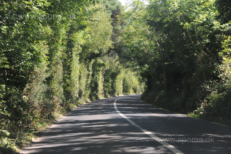 På vej til Hook Head. Høje hække og træer er almindelige langs de irske landeveje, og det er mange steder svært at se det omkringliggende landskab.